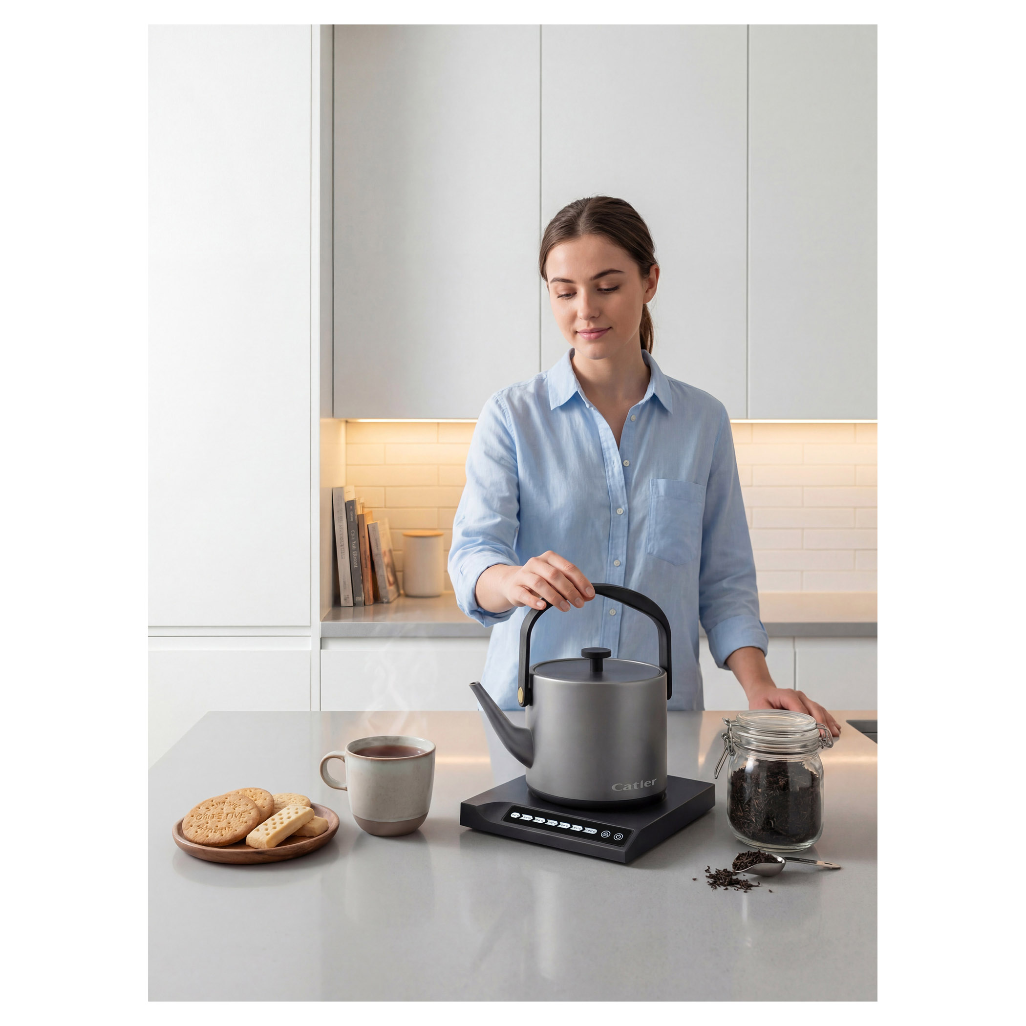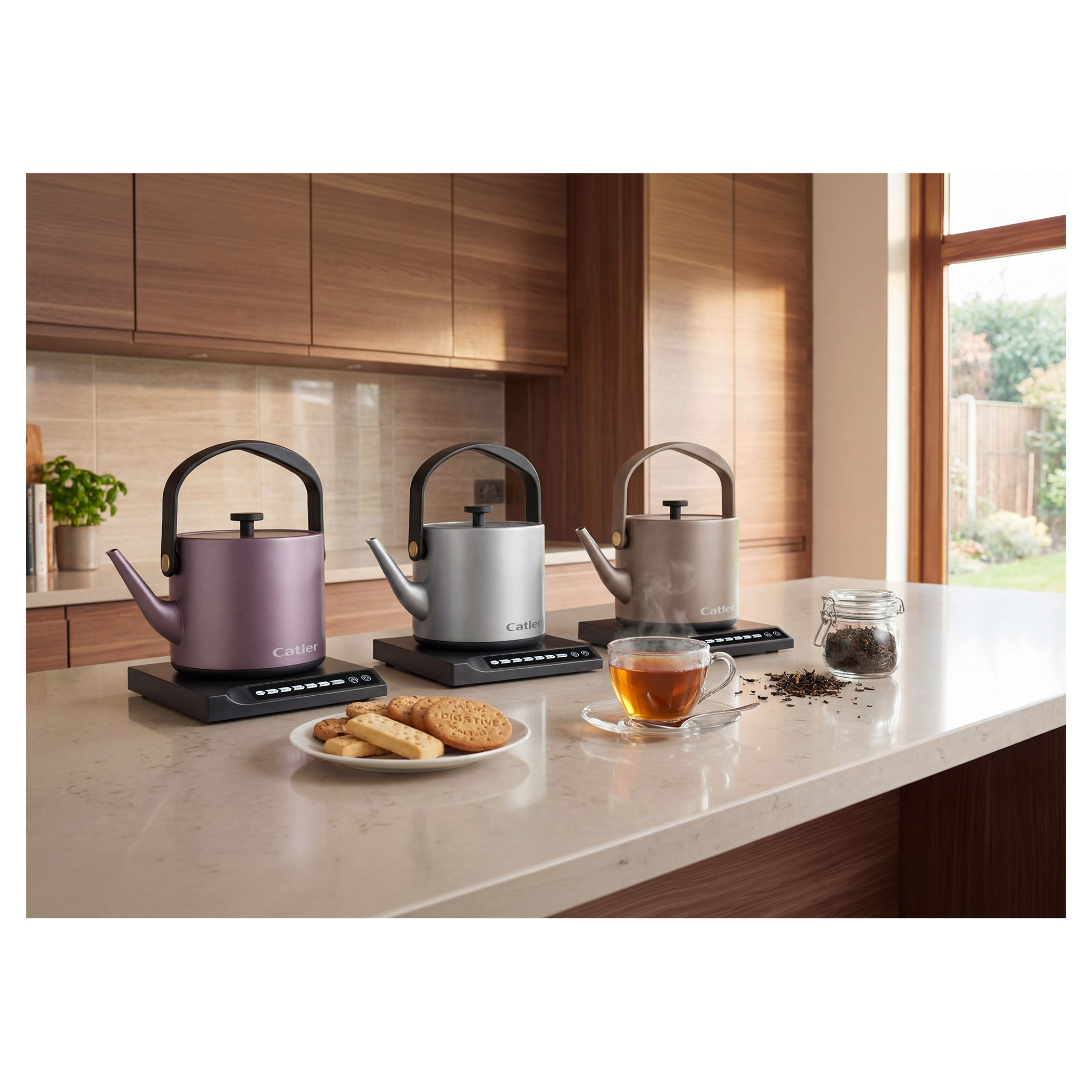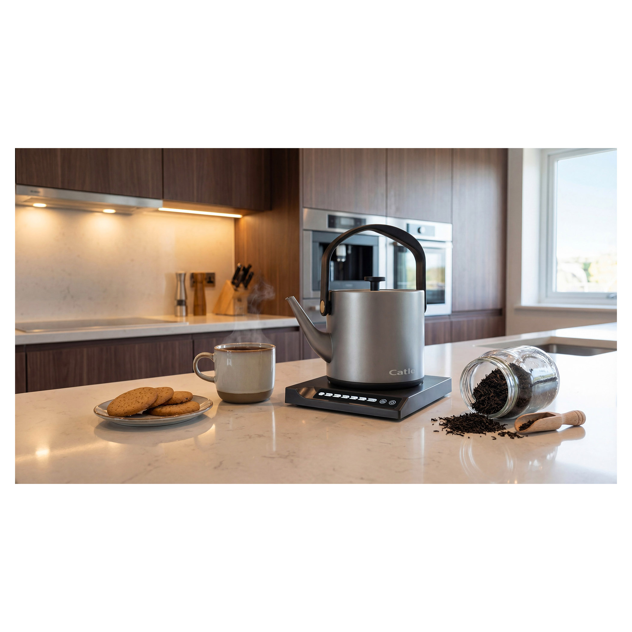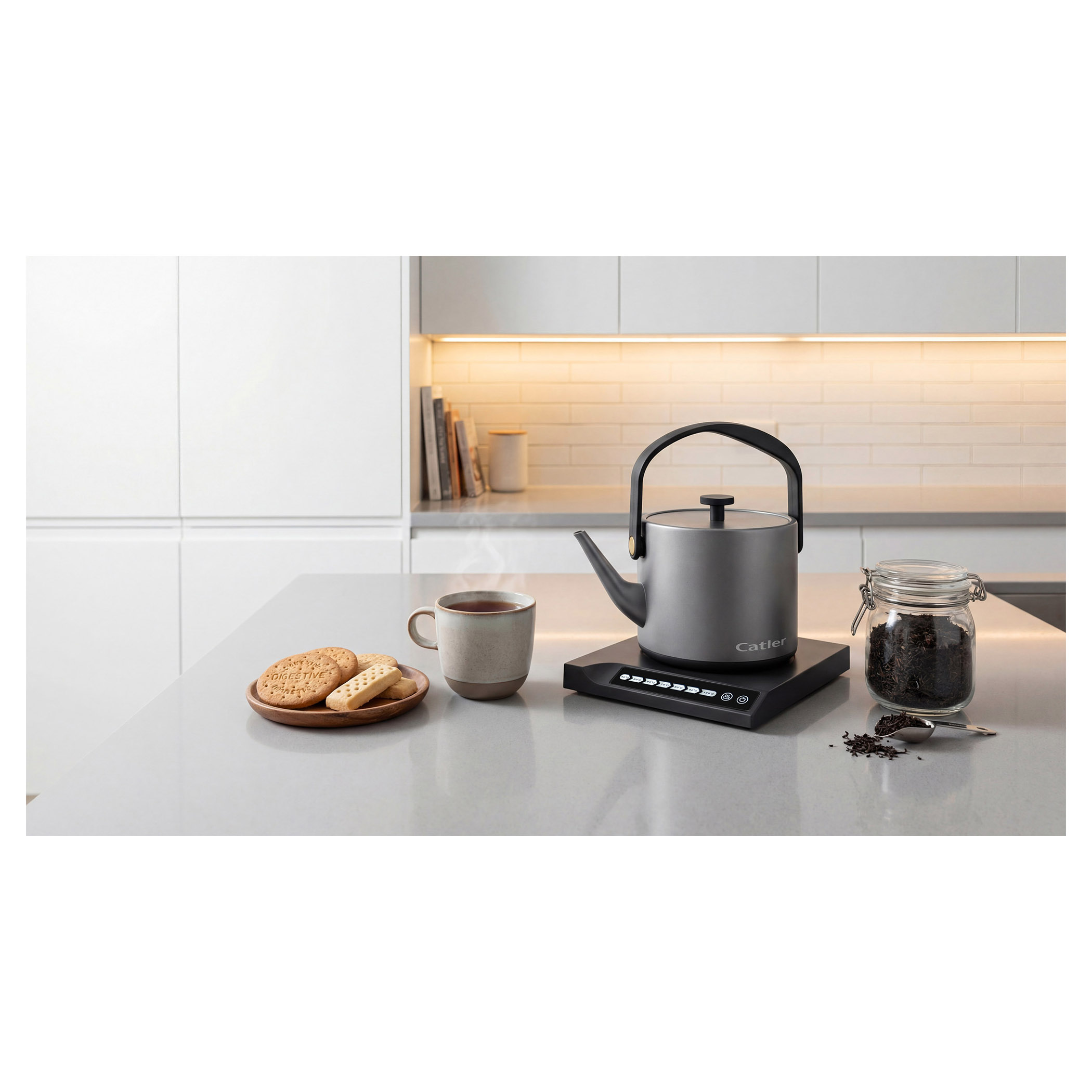 Elektrická varná konvice s regulací teploty a dotykovým ovládacím panelem.